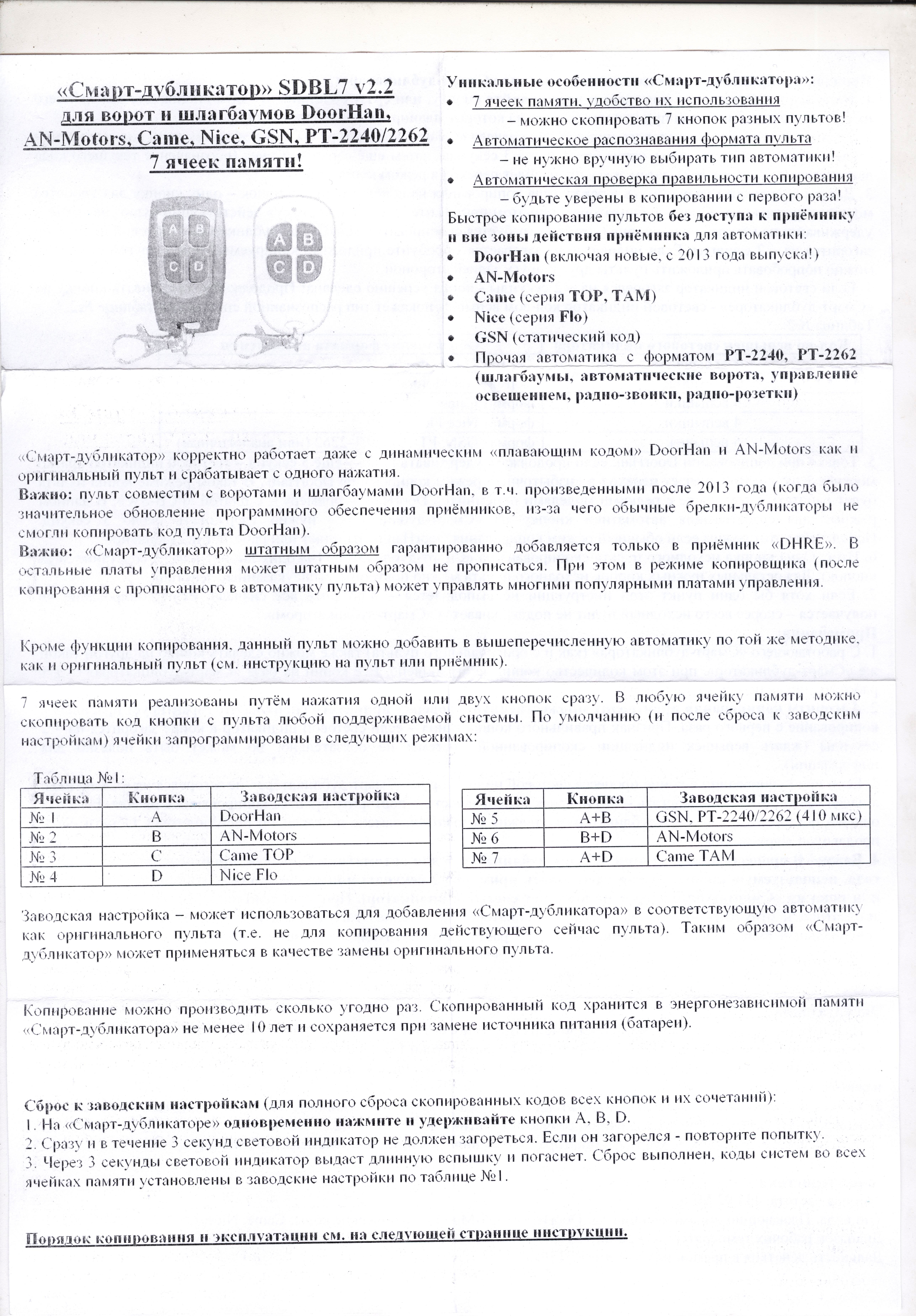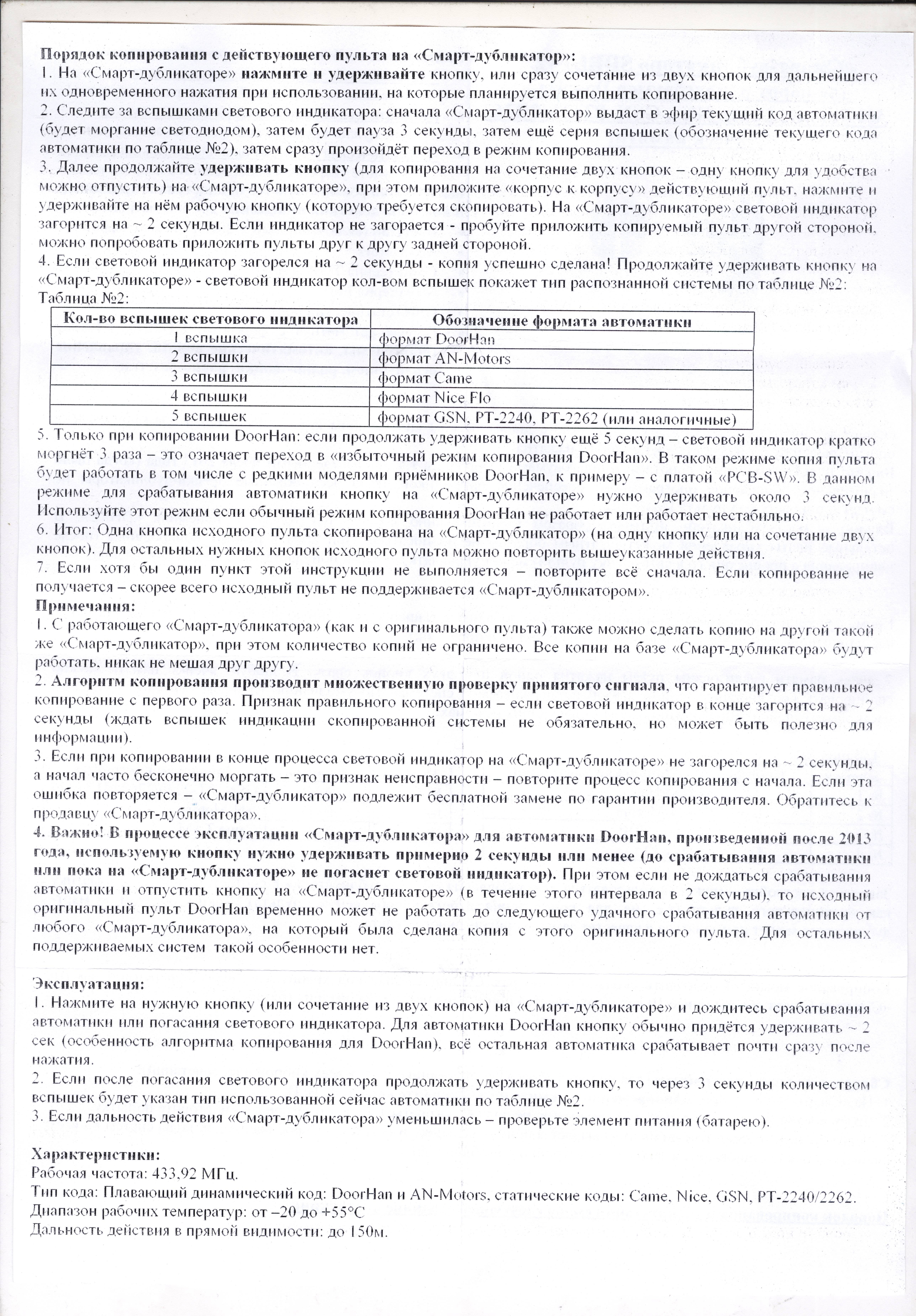 Уникальные особенности «Смарт-дубликатора»:1.) 7 ячеек памяти, удобство их использования – можно скопировать 7 кнопок разных пультов! 2.) Автоматическое распознавания формата пульта – не нужно вручную выбирать тип автоматики! 3.)Автоматическая проверка правильности копирования – будьте уверены в копировании с первого раза! 4.) Быстрое копирование пультов без доступа к приёмнику и вне зоны действия приёмника для автоматики: DoorHan (включая новые, с 2013 года выпуска!), AN-Motors, Came (серия TOP, TAM), Nice (серия Flo), GSN (статический код), Прочая автоматика с форматом PT-2240, РТ-2262 (шлагбаумы, автоматические ворота, управление освещением, радио-звонки, радио-розетки). «Смарт-дубликатор» корректно работает даже с динамическим «плавающим кодом» DoorHan и AN-Motors как и оригинальный пульт и срабатывает с одного нажатия.