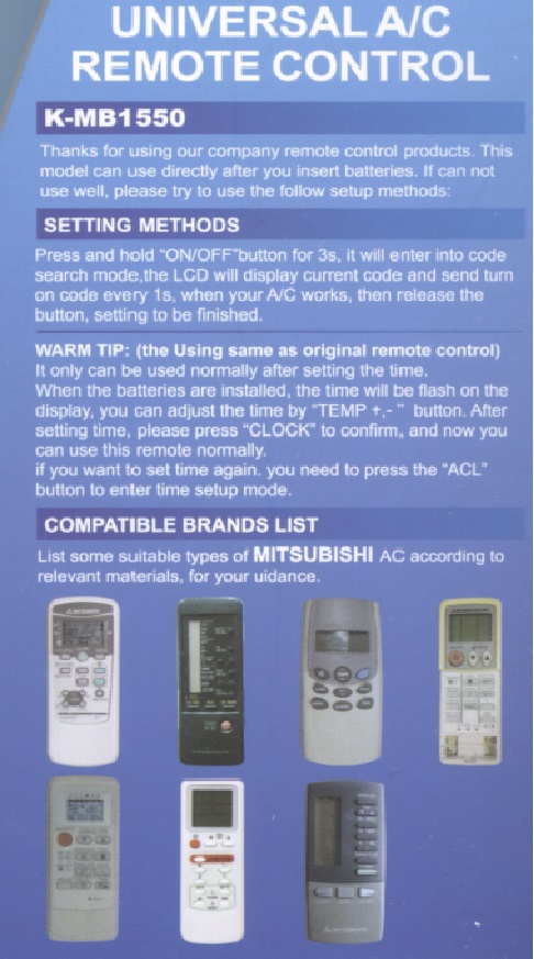 Разработан компанией Huayu специально для кондиционеров марки Mitsubishi. Подойдет практически для любого кондиционера Mitsubishi управляемого с беспроводного пульта.