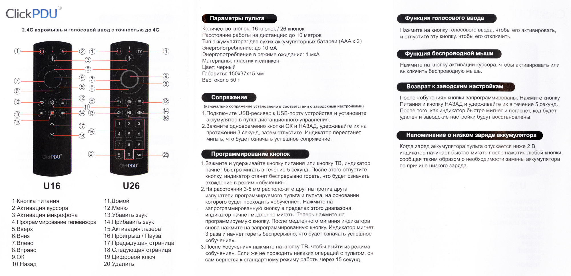 Универсальный пульт ClickPDU U26 Air Mouse - беспроводная аэро мышь со встроенным гироскопом и голосовым управлением!