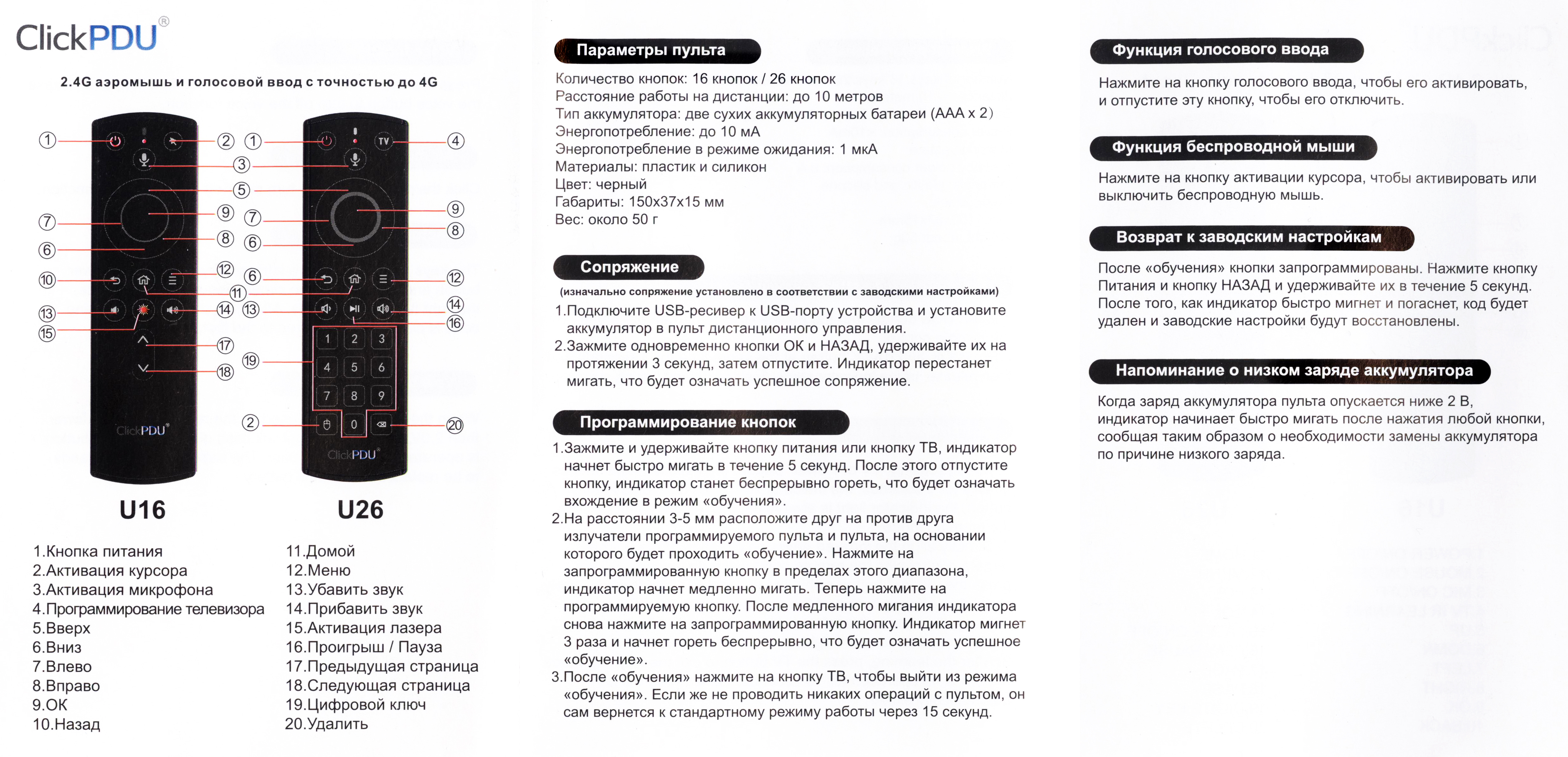 Универсальный пульт ClickPDU U16 Air Mouse - беспроводная аэро мышь со встроенным гироскопом, голосовым управлением и лазерной указкой! Так же у пульта можно обучить кнопку включения от другого инфракрасного пульта. Пульт способен осуществлять голосовое управление в системах Android IP TV, а так же управление голосовыми помощниками на ПК с системами Windows, Linux, Mac OS (Яндекс.Алиса, Google ассистент, MAC OS Siri).