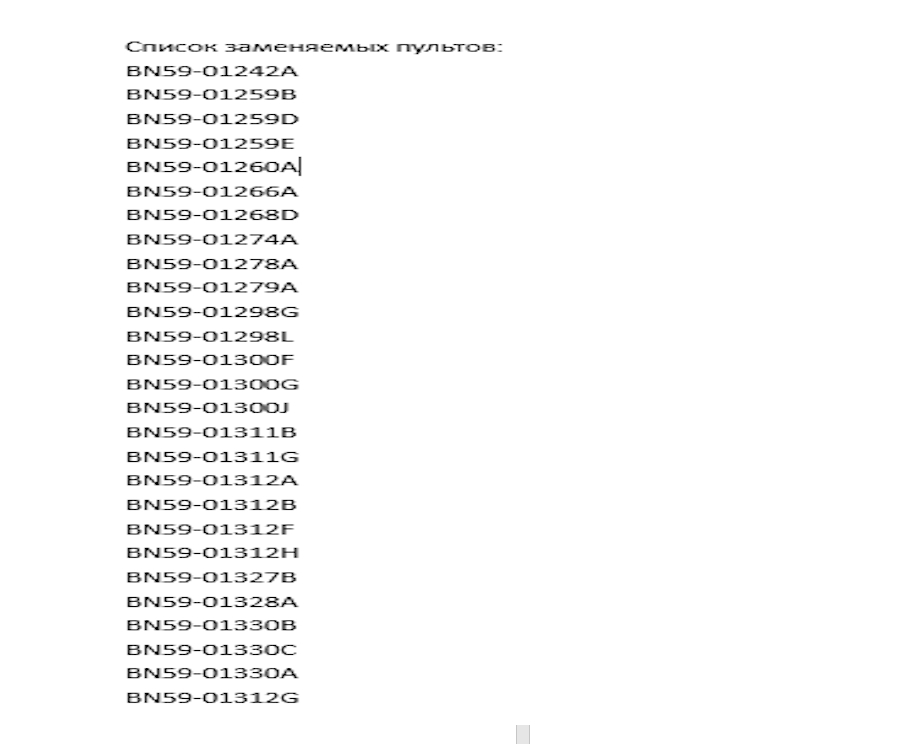 Рекомендуется для замены ПДУ в схожих корпусах (кроме голосового поиска): BN59-01259B, BN59-01358B, BN59-01358C, BN59-01358F, BN59-01242A, BN59-01242C, BN59-01265A, BN59-01266A, BN59-01270A, BN59-01274A, BN59-01278A, BN59-01290A, BN59-01298G, BN59-01300F, BN59-01300G, BN59-01300J, BN59-01309B, BN59-01311B, BN59-01311G, BN59-01311H, BN59-01312B, BN59-01312H, BN59-01312R, BN59-01335B, BN59-01336B, BN59-01350J, BN59-01357B, BN59-01357C, BN59-01357H, BN59-01363G, BN59-01385B, TM1750A, TM1270A, TM1790A.