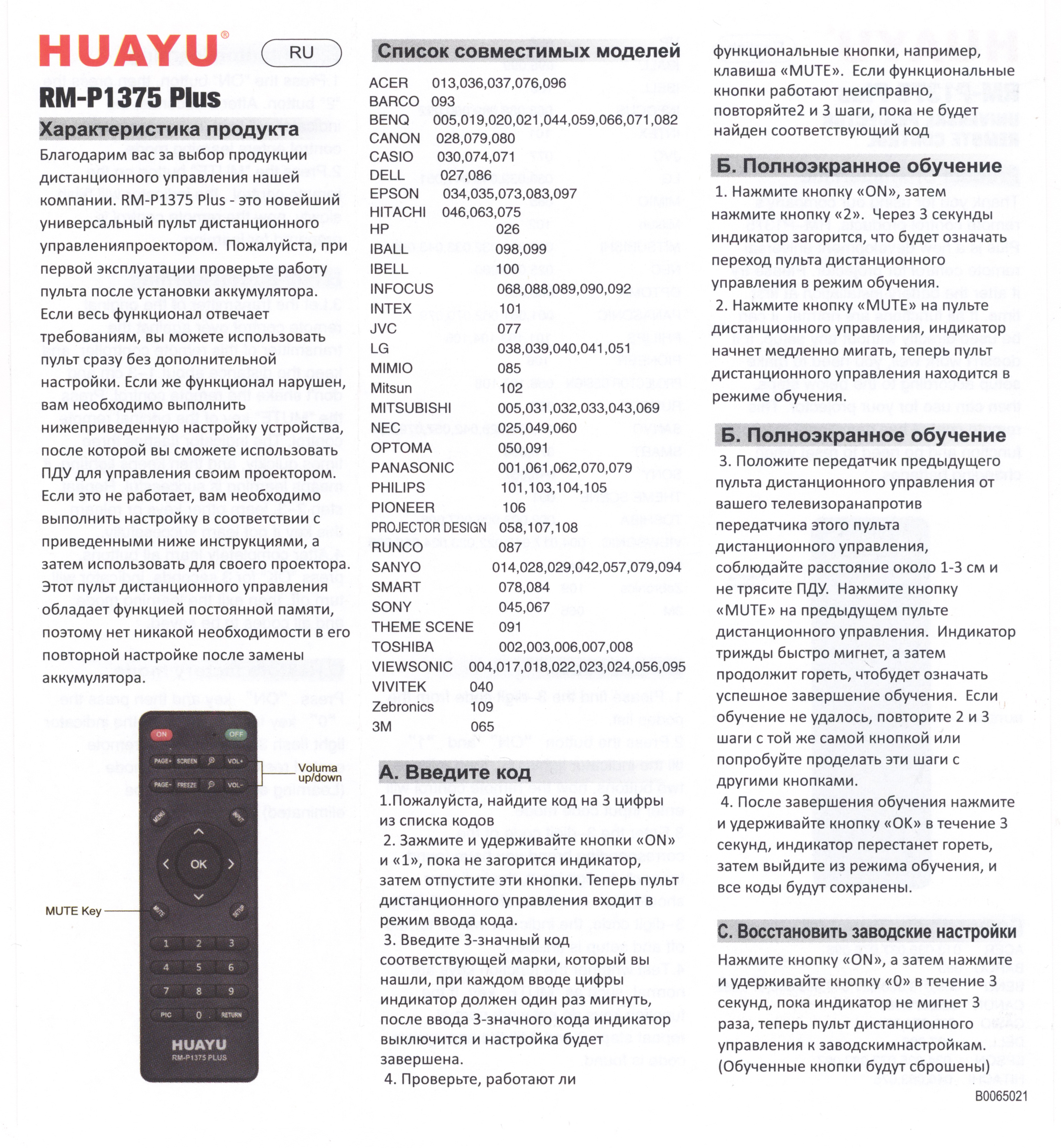 Универсальный пульт Huayu RM-P1375 для проекторов различных марок!