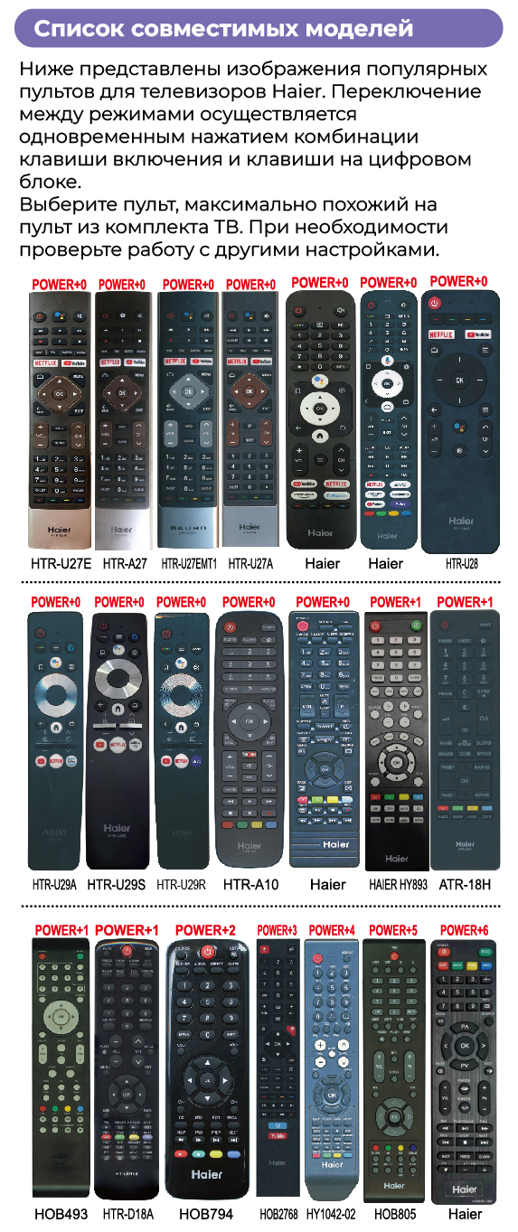 После установки батареек проверьте функционал, если все работает - используйте без дополнительных настроек. В других случаях может потребоваться настройка, для этого одновременно зажмите кнопку Power (Питание) и цифру от 0 до 6 в зависимости от типа вашего пульта указанного в таблице. Попробуйте каждый из режимов, пока функционал не устроит вас полностью. RM-L1657 заменяет более 20 моделей пультов, например такие как: HTR-U27E, HTR-A27, HTR-U27EMT1, HTR-U27A, HTR-U28, HTR-U29A, HTR-U29S, HTR-U29R, HTR-A10, HY893, HTR-18H, ATR-18H, HTR-D18A, HY1042-02 и другие. Обратите внимание! Пульт подходит для Smart TV Haier, но работает только на ИК сигнале и не имеет микрофона и голосового поиска. Пульт произведен в соответствии с высокими мировыми стандартами качества и безопасности, что подтверждается соответствующей сертификацией товаров ClickPDU.