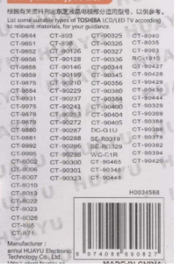 Универсальный пульт HUAYU RM-D809 для телевизоров марки TOSHIBA!