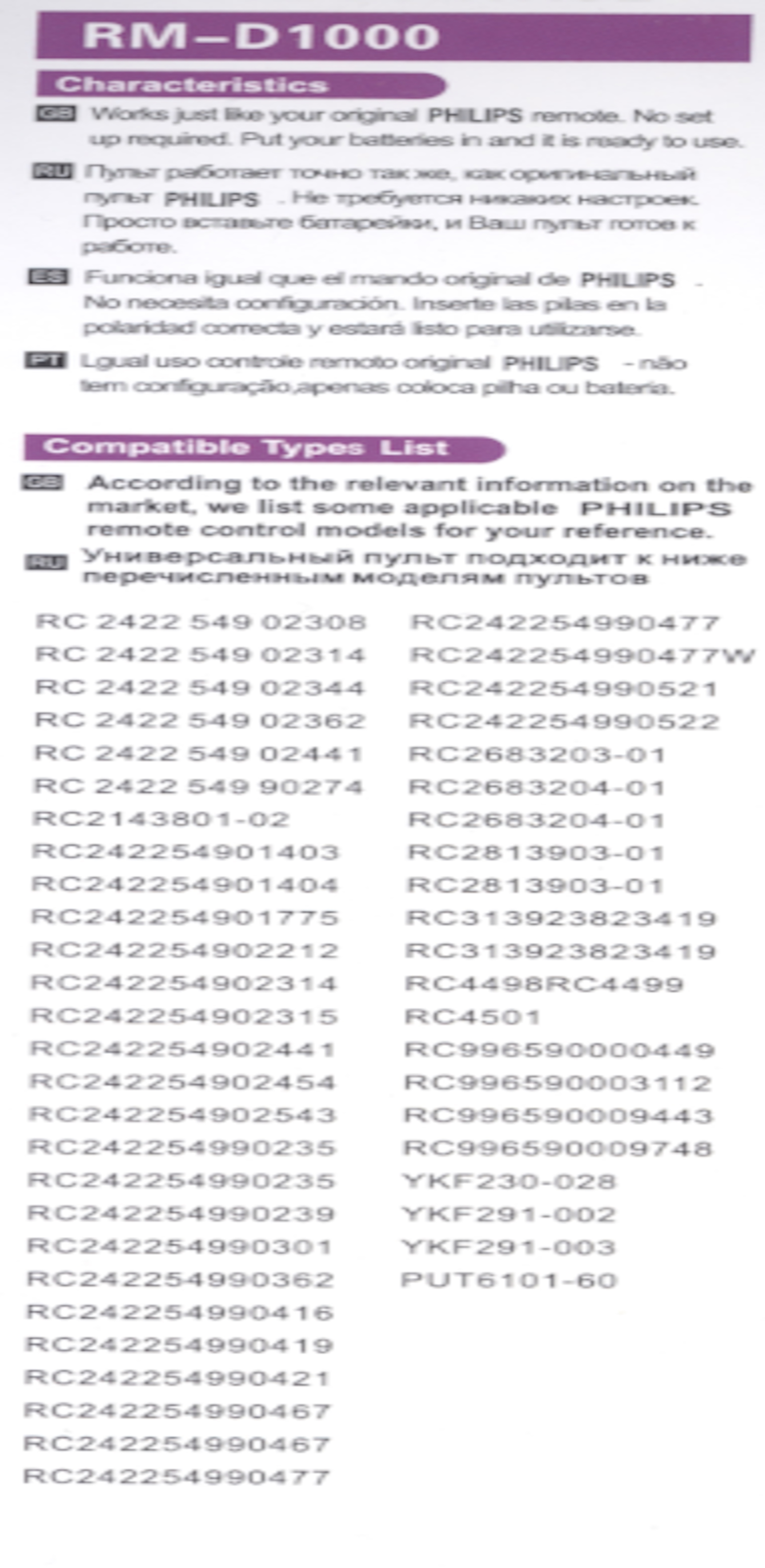 Заменяет все ИК пульты PHLIPS и работает без настройки.