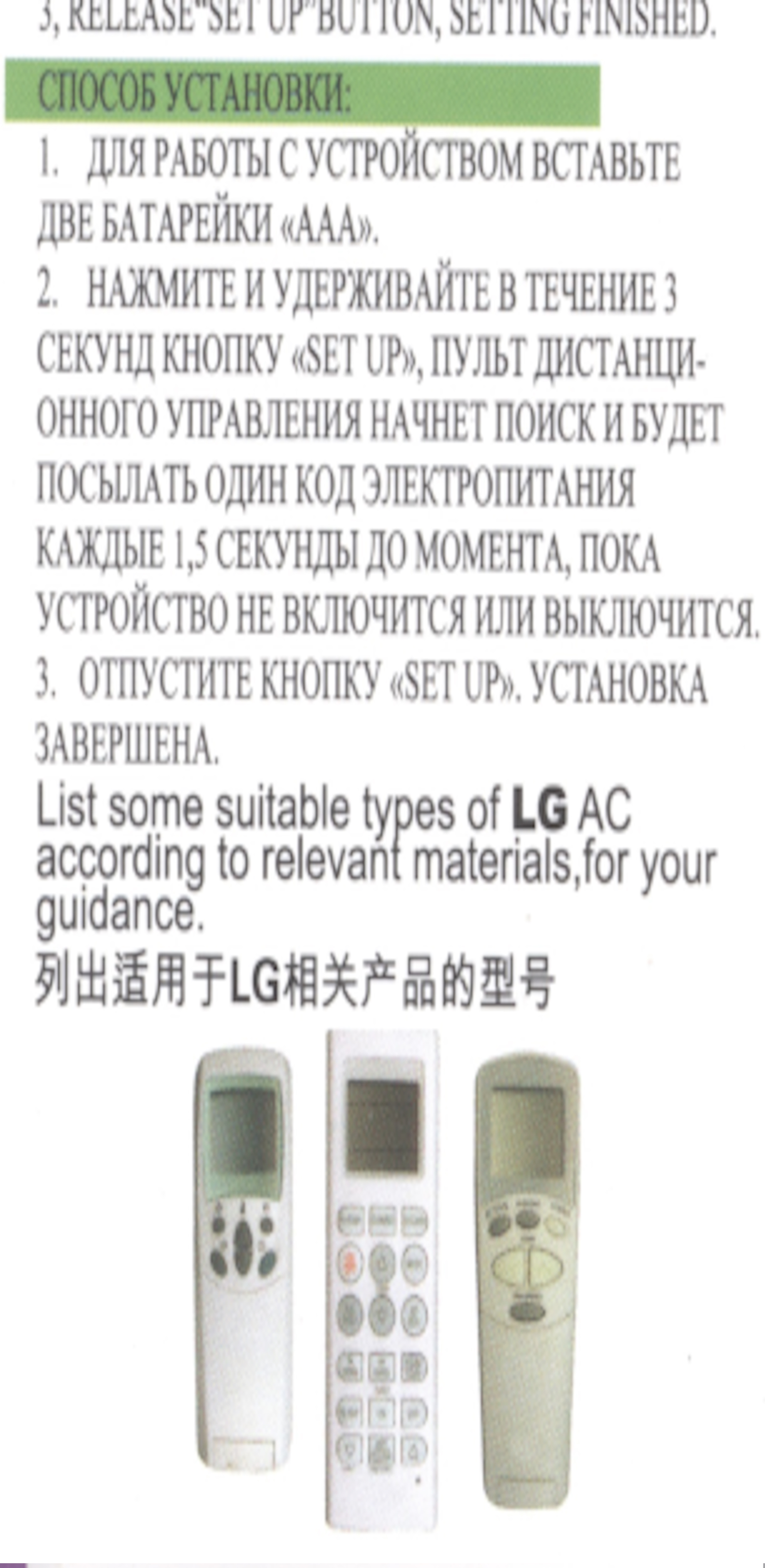 Разработан компанией Huayu специально для кондиционеров марки LG. Подойдет практически для любого кондиционера LG управляемого с беспроводного пульта.